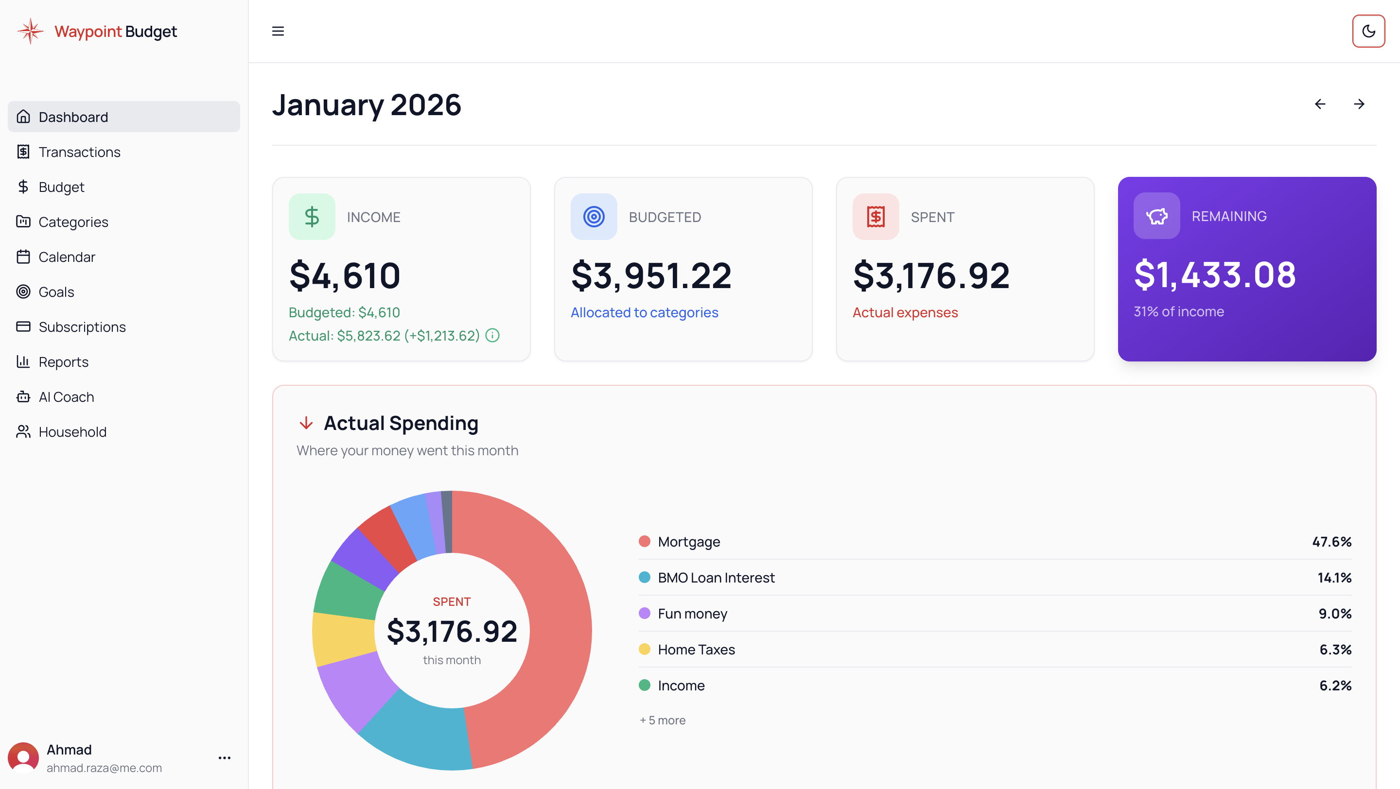 What you get on the free tier: Unlimited manual transactions, receipt scanning (upload photos), CSV import, unlimited budget categories, AI Coach (5 messages/day), 24 months of history, and full goal tracking.